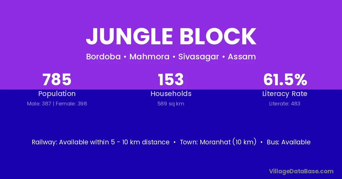 Jungle Block village has a total population of 785 people, of which 387 are males and 398 are females.