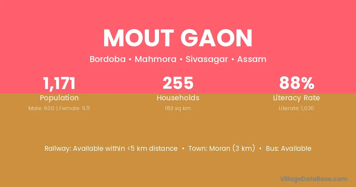 Moran (3 km) is the nearest town to Mout Gaon village for major economic activities and is located approximately 3 km away.