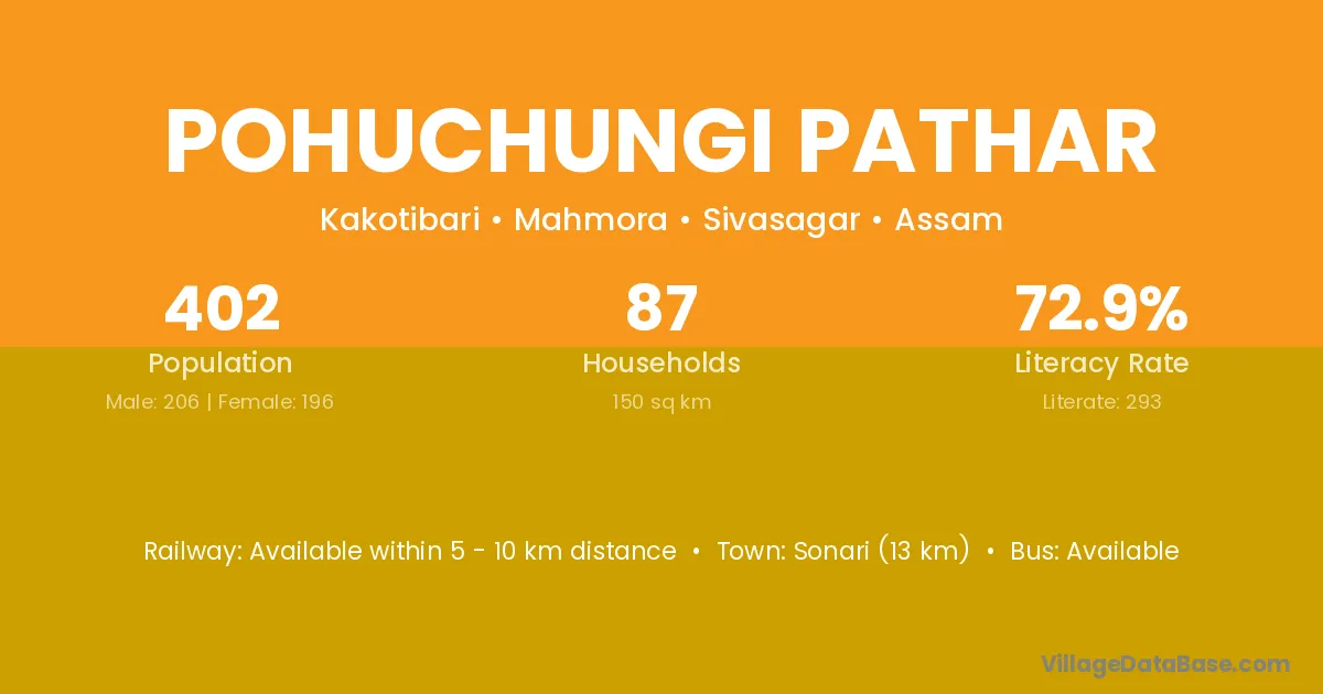 Sonari (13 km) is the nearest town to Pohuchungi Pathar village for major economic activities and is located approximately 13 km away.
