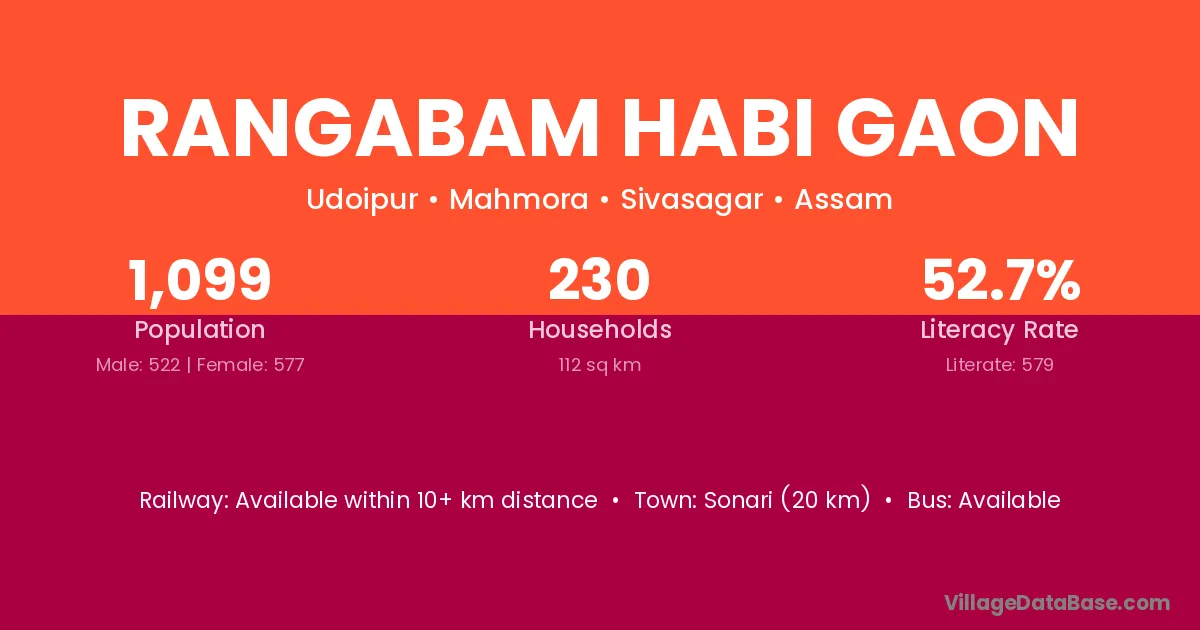 Rangabam Habi Gaon village has a total population of 1,099 people, of which 522 are males and 577 are females.