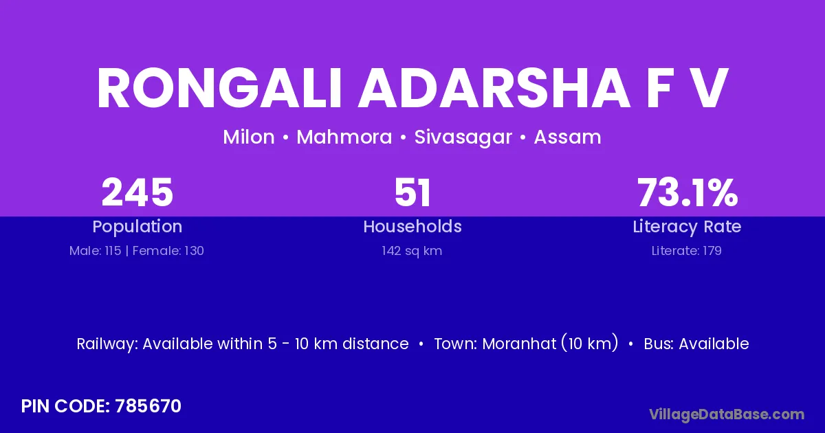 Moranhat (10 km) is the nearest town to Rongali Adarsha F V village for major economic activities and is located approximately 10 km away.