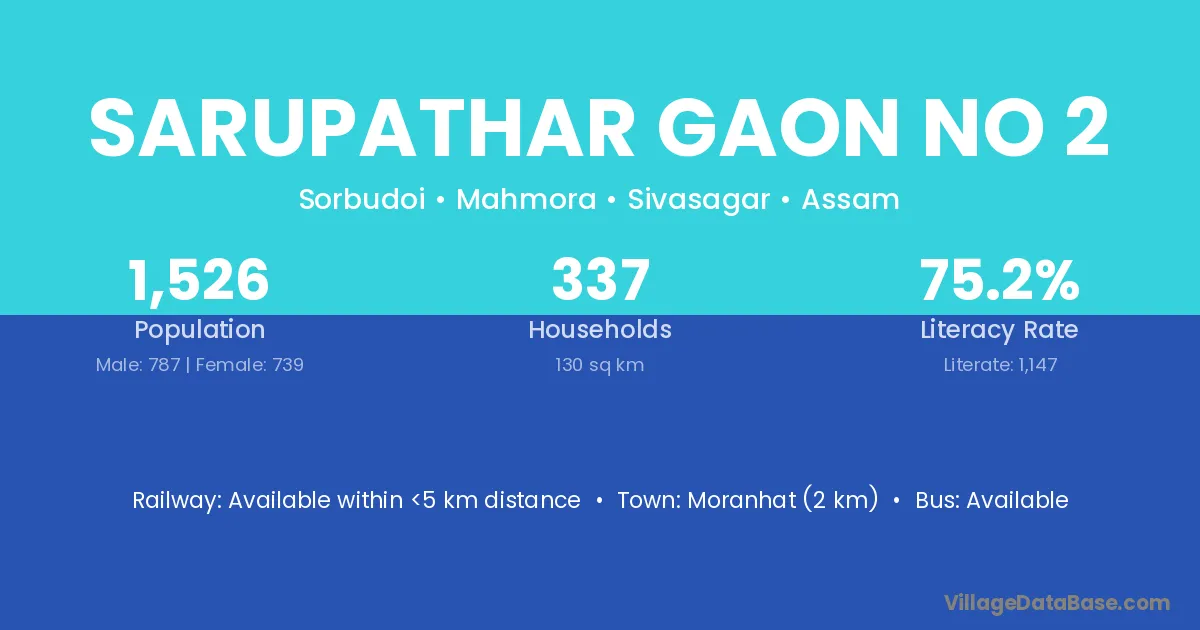 Moranhat (2 km) is the nearest town to Sarupathar Gaon No 2 village for major economic activities and is located approximately 2 km away.