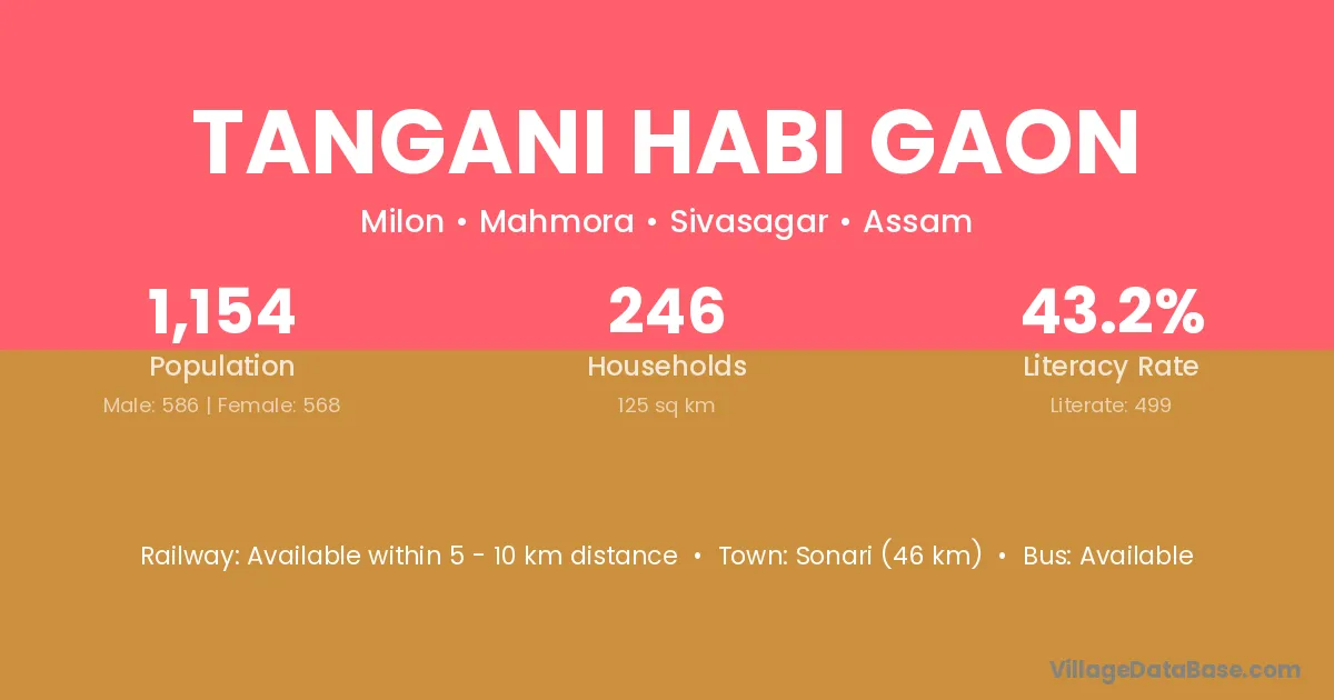 Tangani Habi Gaon village has a total population of 1,154 people, of which 586 are males and 568 are females.