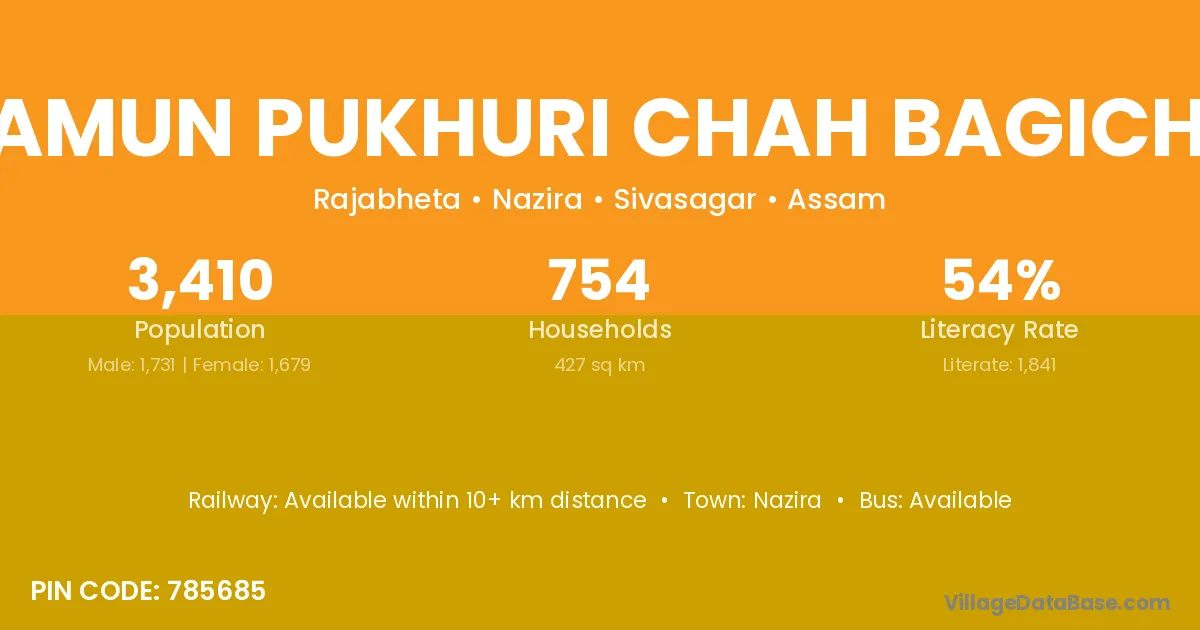Nazira is the nearest town to Bamun Pukhuri Chah Bagicha village for major economic activities