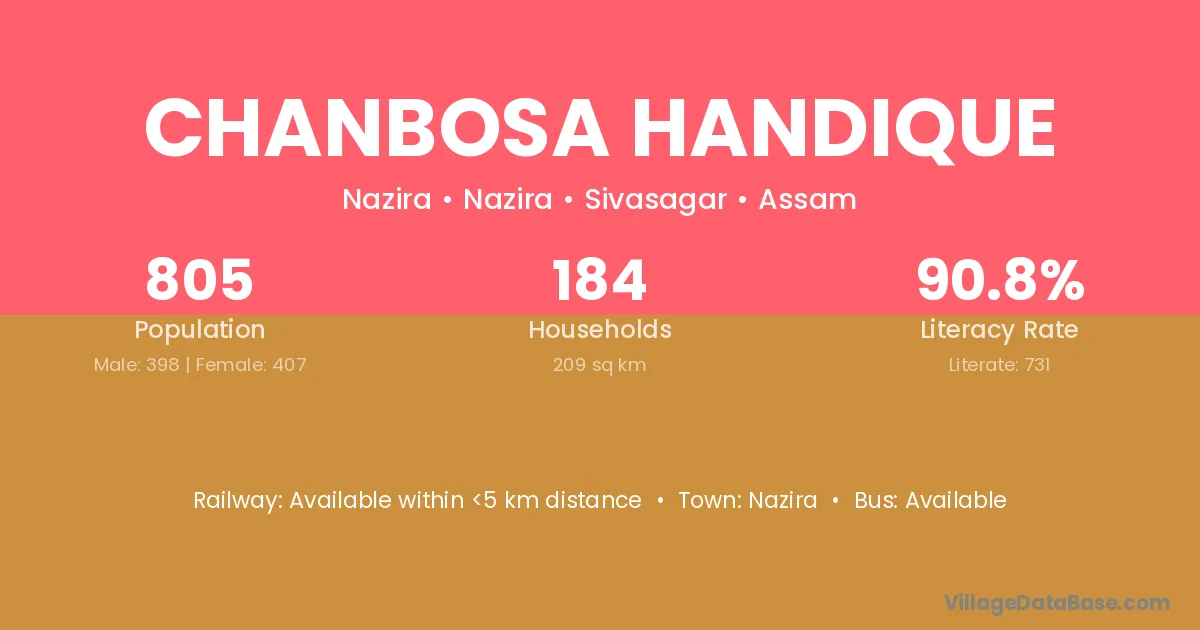 Chanbosa Handique village has a total population of 805 people, of which 398 are males and 407 are females.
