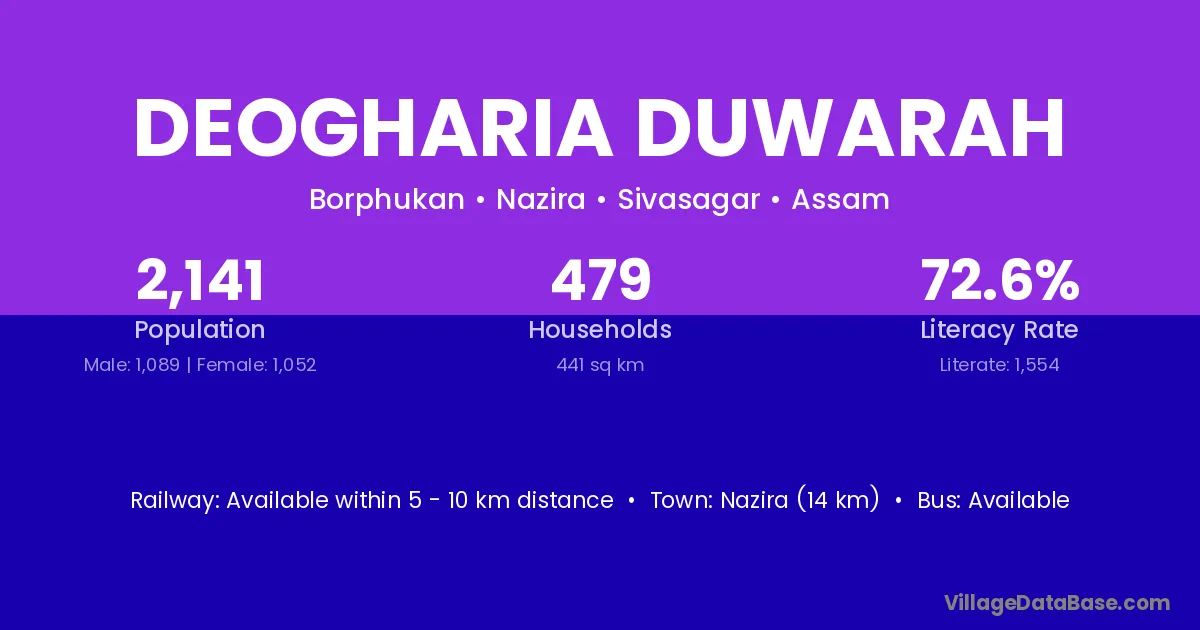 Deogharia Duwarah village has a total population of 2,141 people, of which 1,089 are males and 1,052 are females.