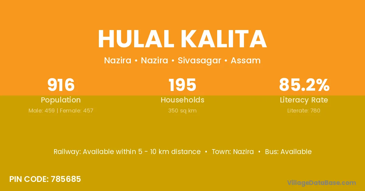 Hulal Kalita village has a total population of 916 people, of which 459 are males and 457 are females.