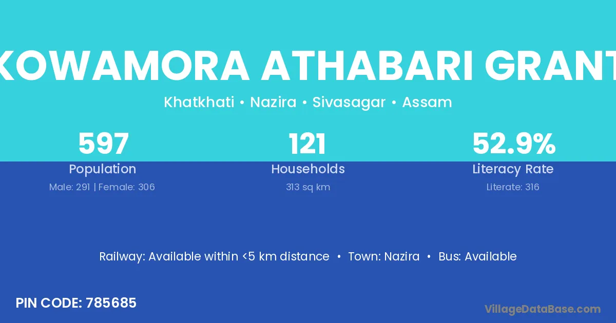 Kowamora Athabari Grant village has a total population of 597 people, of which 291 are males and 306 are females.
