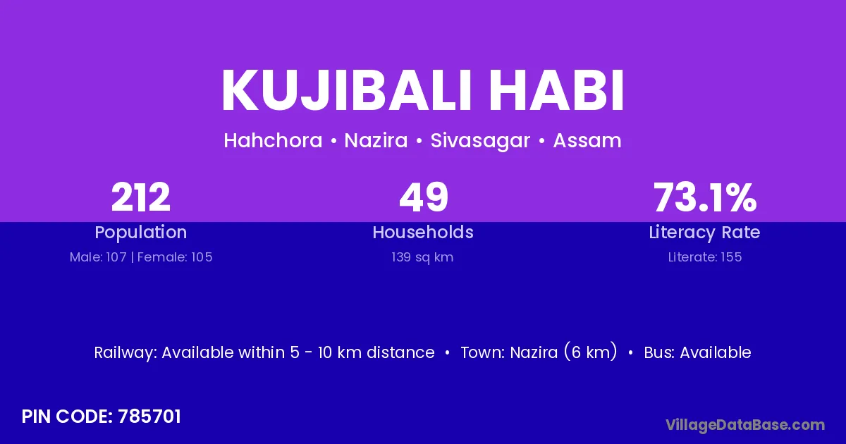 Nazira (6 km) is the nearest town to Kujibali Habi village for major economic activities and is located approximately 6 km away.