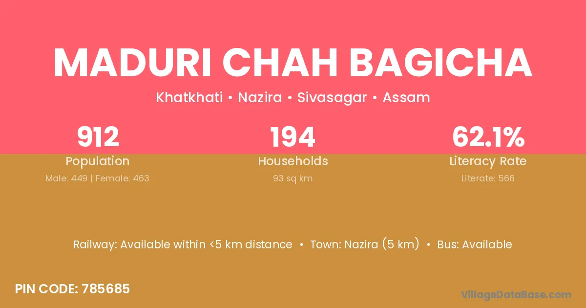 Nazira (5 km) is the nearest town to Maduri Chah Bagicha village for major economic activities and is located approximately 5 km away.