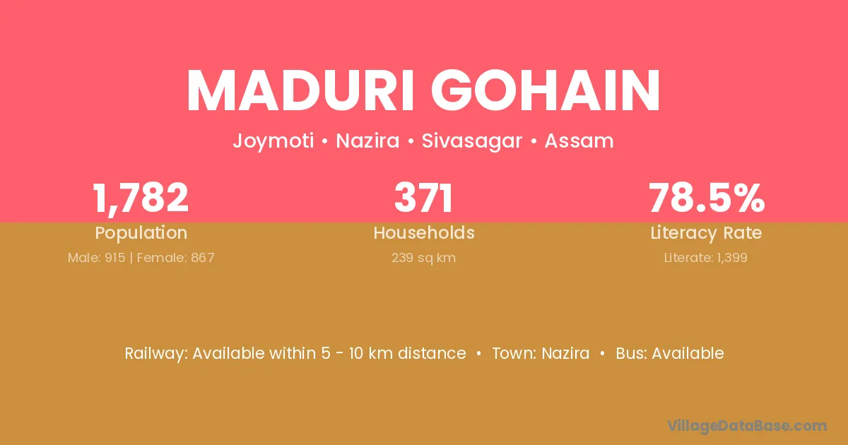 Maduri Gohain village has a total population of 1,782 people, of which 915 are males and 867 are females.