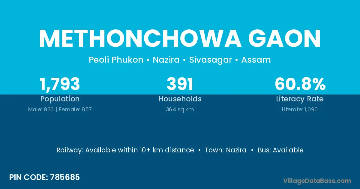 The literacy rate of Methonchowa Gaon village is 60.79%. Male literacy stands at 68.91% and female literacy at 51.93%.