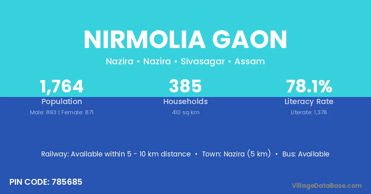 Nazira (5 km) is the nearest town to Nirmolia Gaon village for major economic activities and is located approximately 5 km away.