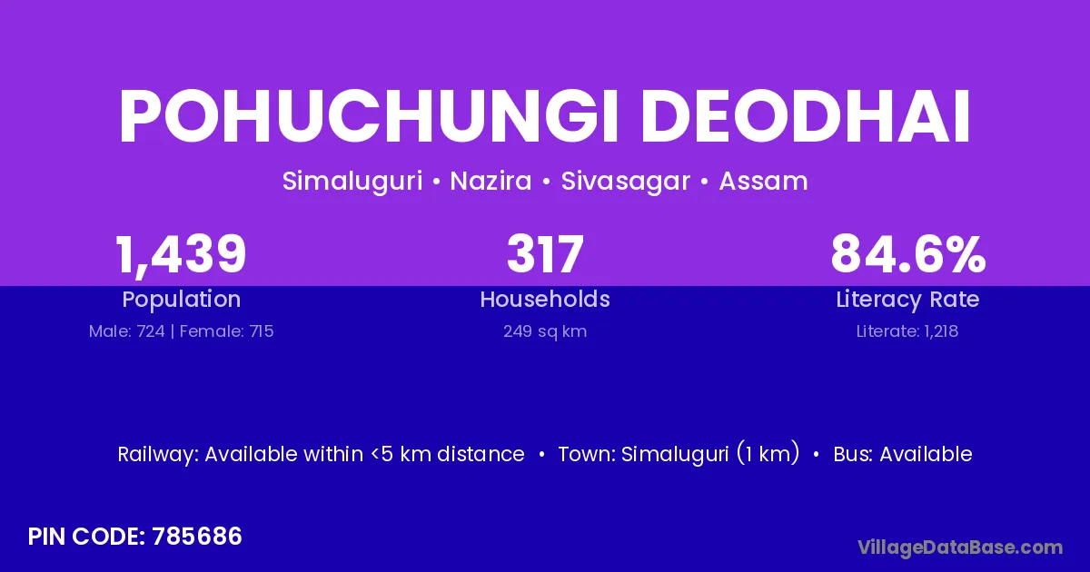 Simaluguri (1 km) is the nearest town to Pohuchungi Deodhai village for major economic activities and is located approximately 1 km away.