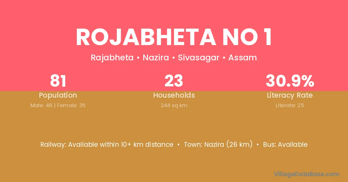 Nazira (26 km) is the nearest town to Rojabheta No 1 village for major economic activities and is located approximately 26 km away.