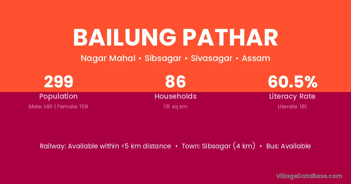 Sibsagar (4 km) is the nearest town to Bailung Pathar village for major economic activities and is located approximately 4 km away.