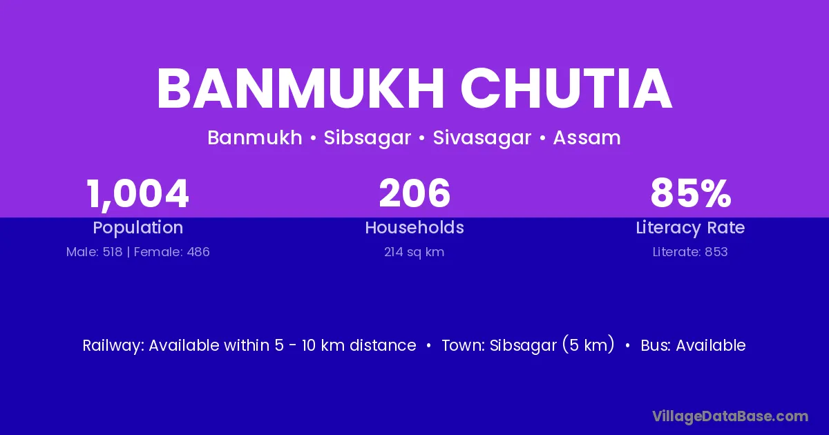 Sibsagar (5 km) is the nearest town to Banmukh Chutia village for major economic activities and is located approximately 5 km away.