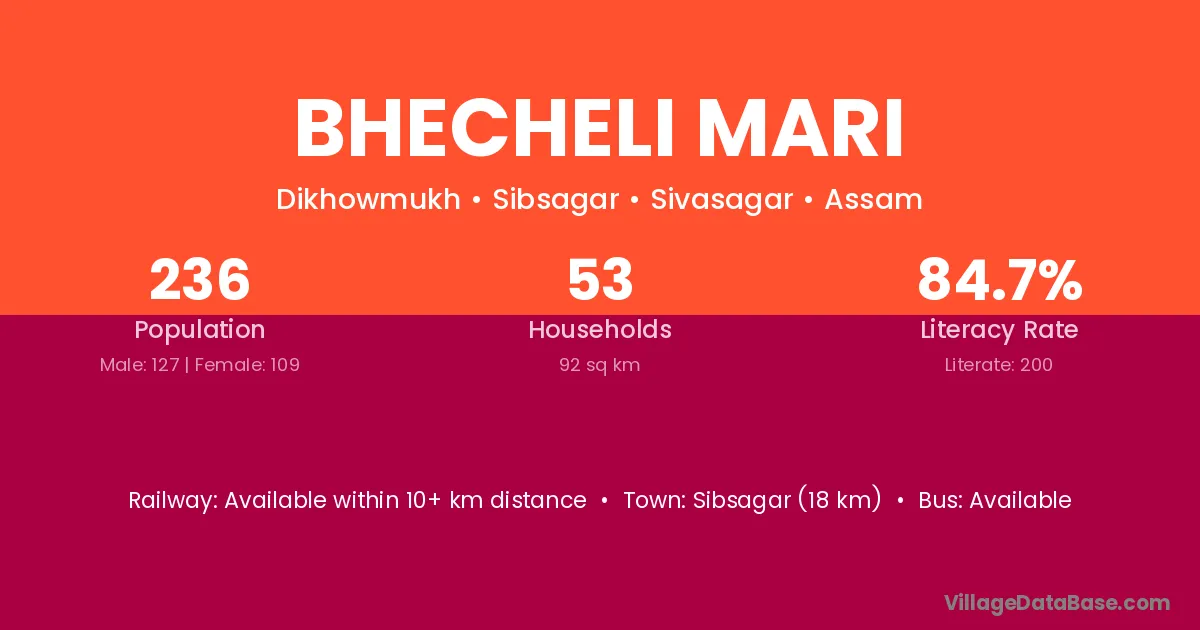 Sibsagar (18 km) is the nearest town to Bhecheli Mari village for major economic activities and is located approximately 18 km away.