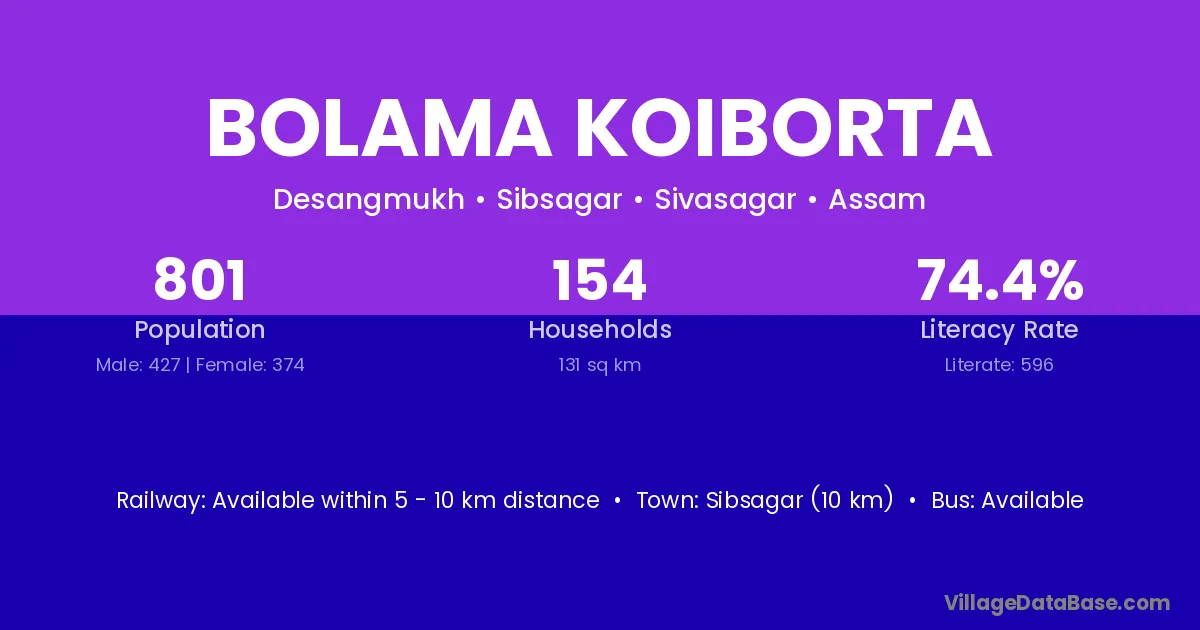 Sibsagar (10 km) is the nearest town to Bolama Koiborta village for major economic activities and is located approximately 10 km away.