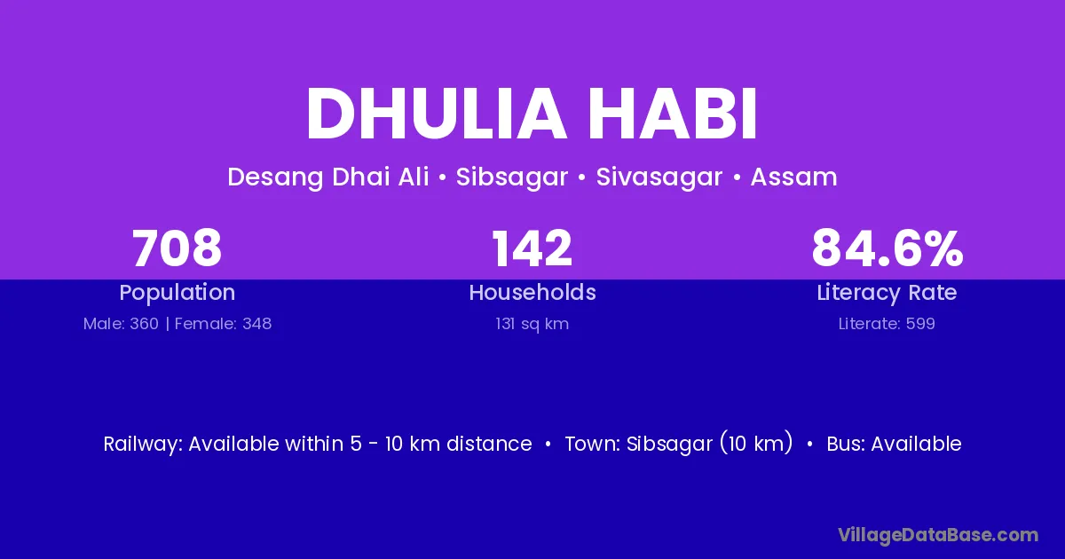 Sibsagar (10 km) is the nearest town to Dhulia Habi village for major economic activities and is located approximately 10 km away.