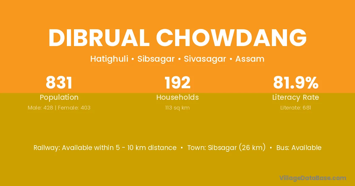 Dibrual Chowdang village has a total population of 831 people, of which 428 are males and 403 are females.