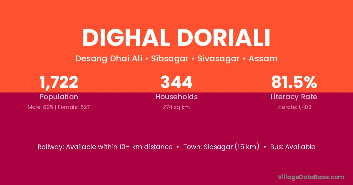 Sibsagar (15 km) is the nearest town to Dighal Doriali village for major economic activities and is located approximately 15 km away.