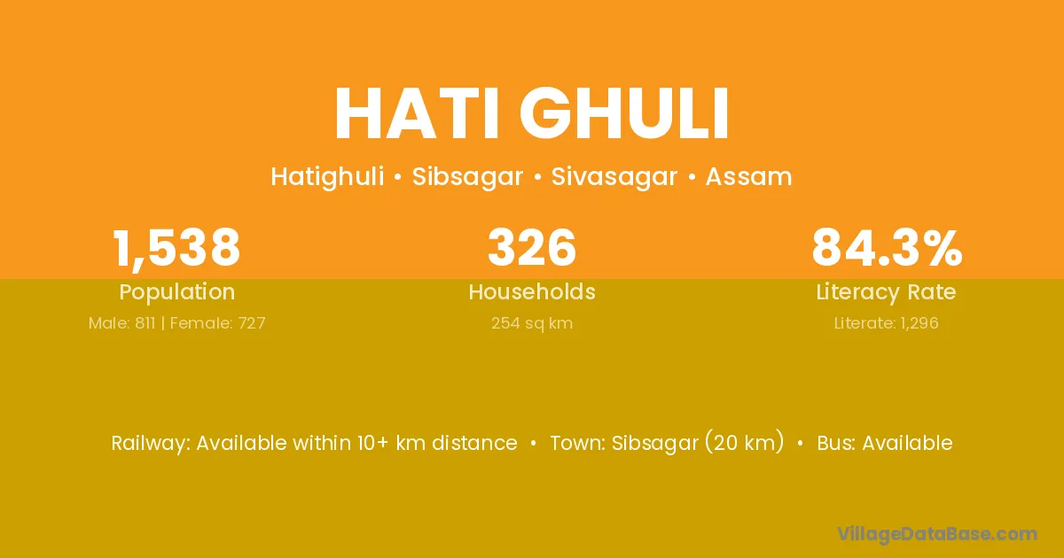 Sibsagar (20 km) is the nearest town to Hati Ghuli village for major economic activities and is located approximately 20 km away.