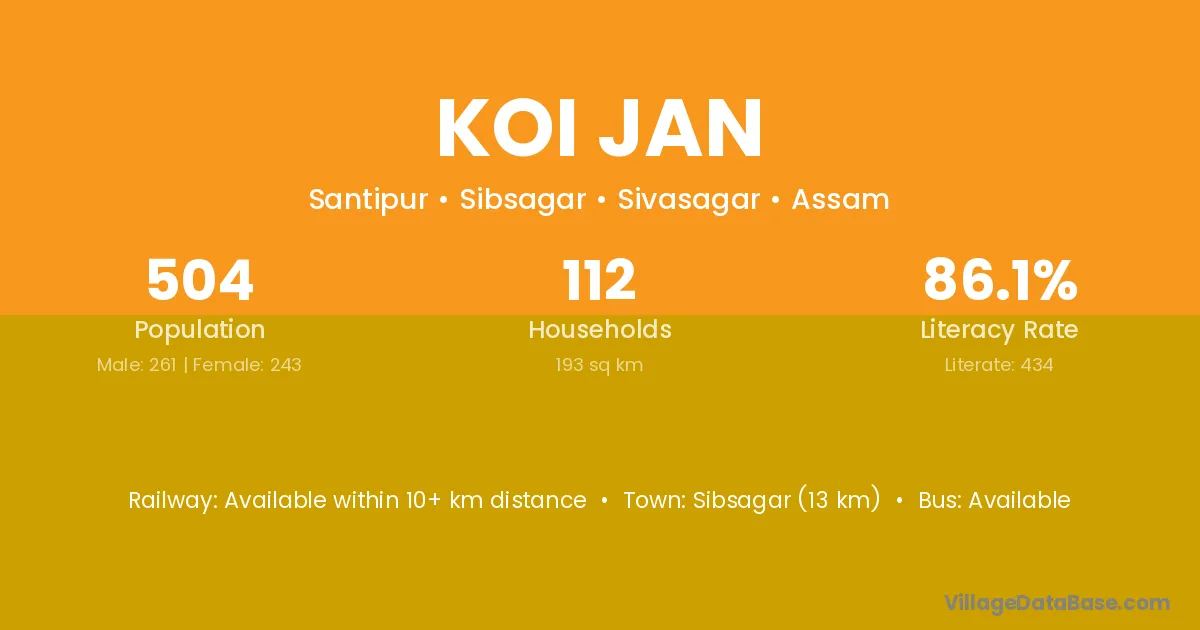 Sibsagar (13 km) is the nearest town to Koi Jan village for major economic activities and is located approximately 13 km away.