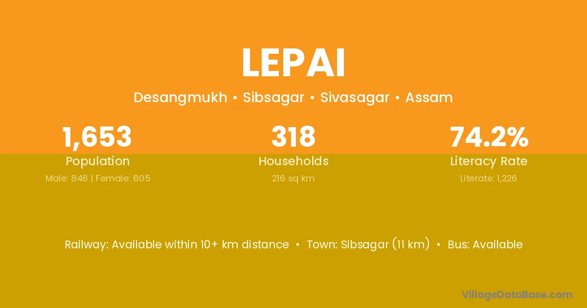 Sibsagar (11 km) is the nearest town to Lepai village for major economic activities and is located approximately 11 km away.