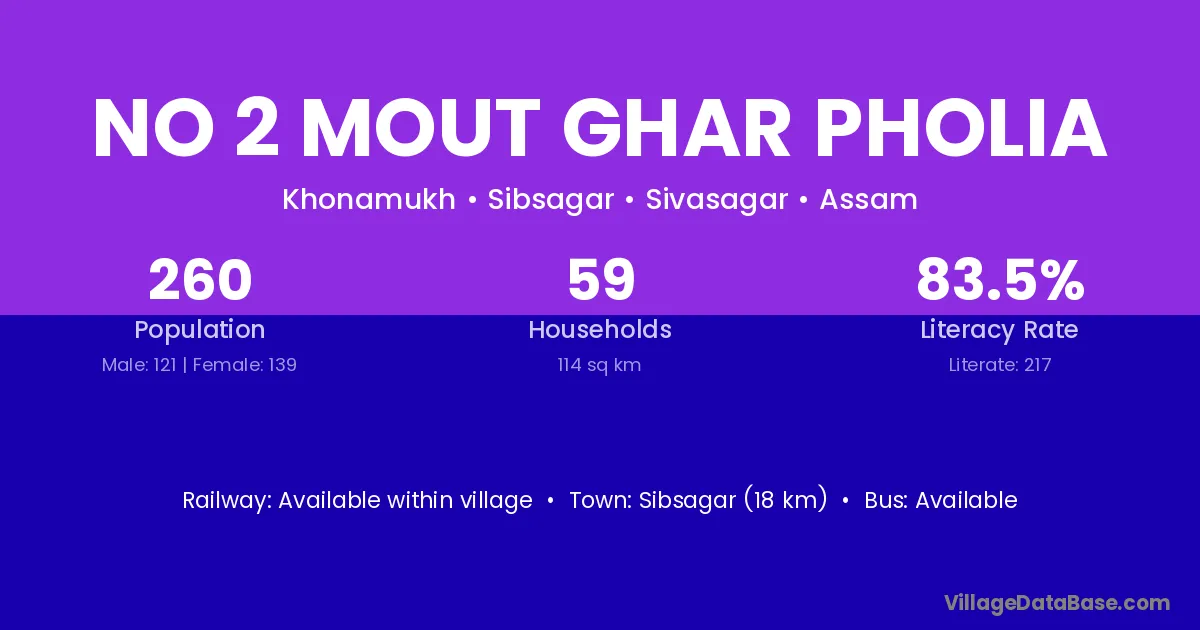 No 2 Mout Ghar Pholia village has a total population of 260 people, of which 121 are males and 139 are females.