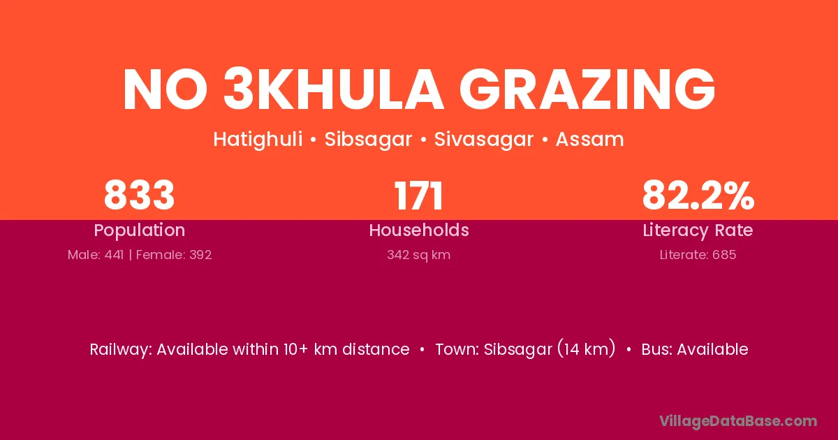 The literacy rate of No 3khula Grazing village is 82.23%. Male literacy stands at 82.77% and female literacy at 81.63%.
