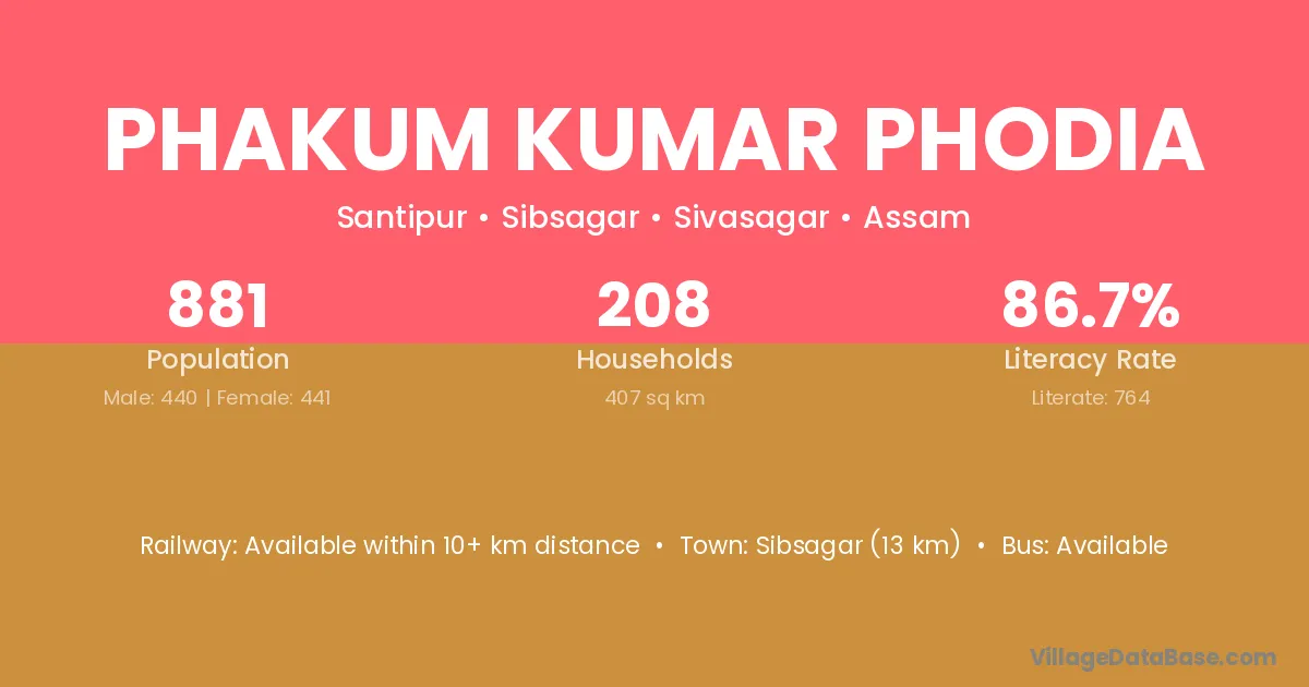 Sibsagar (13 km) is the nearest town to Phakum Kumar Phodia village for major economic activities and is located approximately 13 km away.