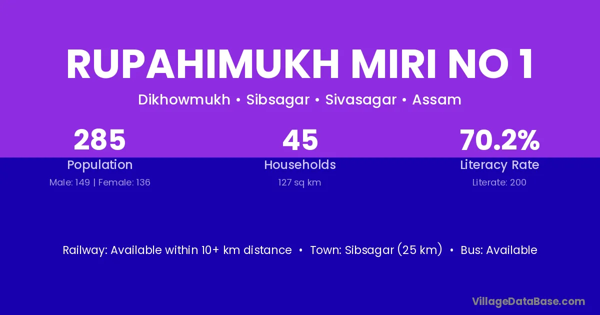 Sibsagar (25 km) is the nearest town to Rupahimukh Miri No 1 village for major economic activities and is located approximately 25 km away.