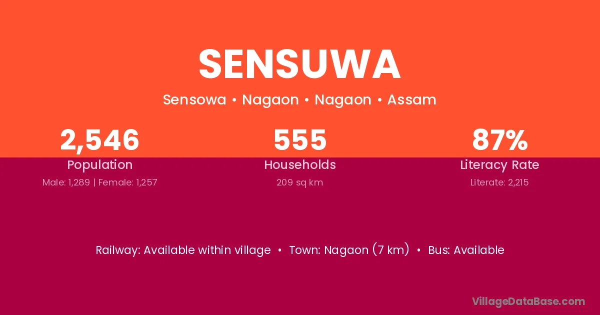 Sibsagar (7 km) is the nearest town to Sensuwa village for major economic activities and is located approximately 7 km away.