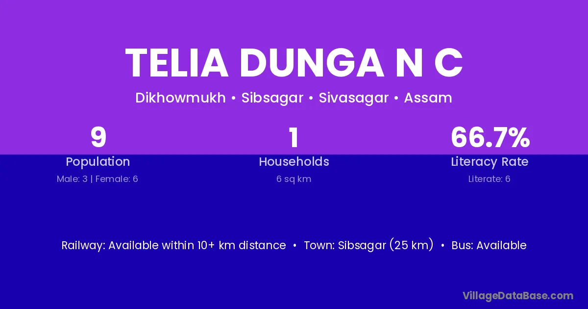 Sibsagar (25 km) is the nearest town to Telia Dunga N C village for major economic activities and is located approximately 25 km away.