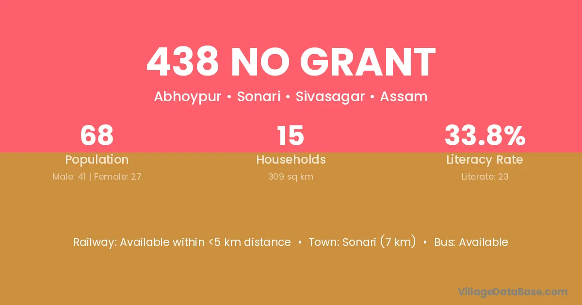 The literacy rate of 438 No Grant village is 33.82%. Male literacy stands at 48.78% and female literacy at 11.11%.