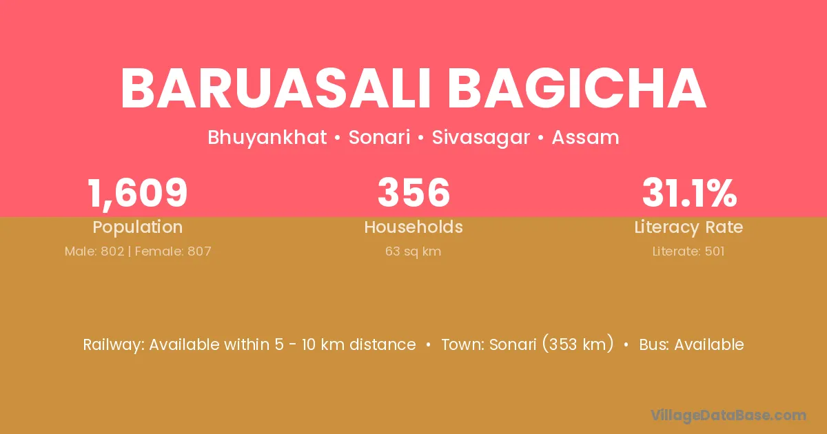 Baruasali Bagicha village has a total population of 1,609 people, of which 802 are males and 807 are females.