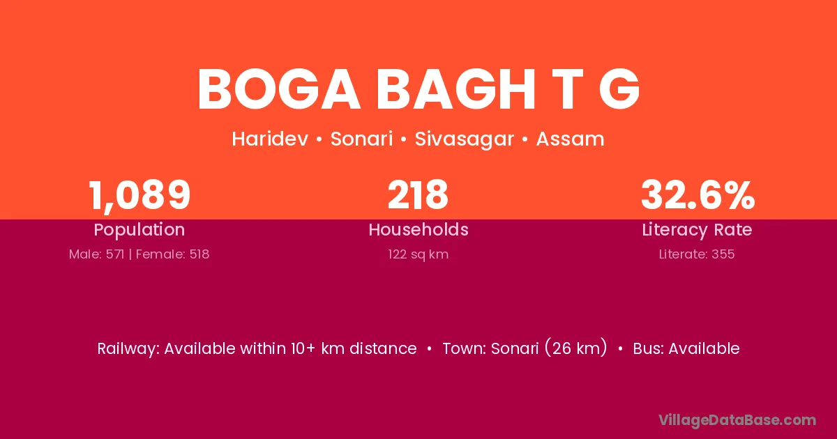 Sonari (26 km) is the nearest town to Boga Bagh T G village for major economic activities and is located approximately 26 km away.