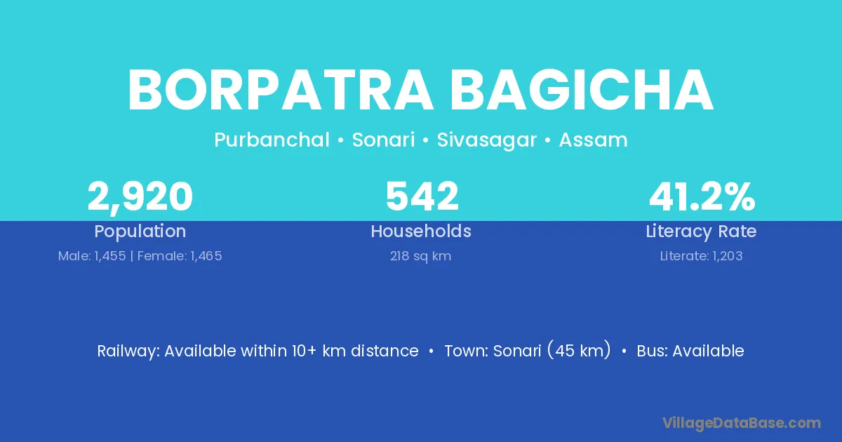 Sonari (45 km) is the nearest town to Borpatra Bagicha village for major economic activities and is located approximately 45 km away.