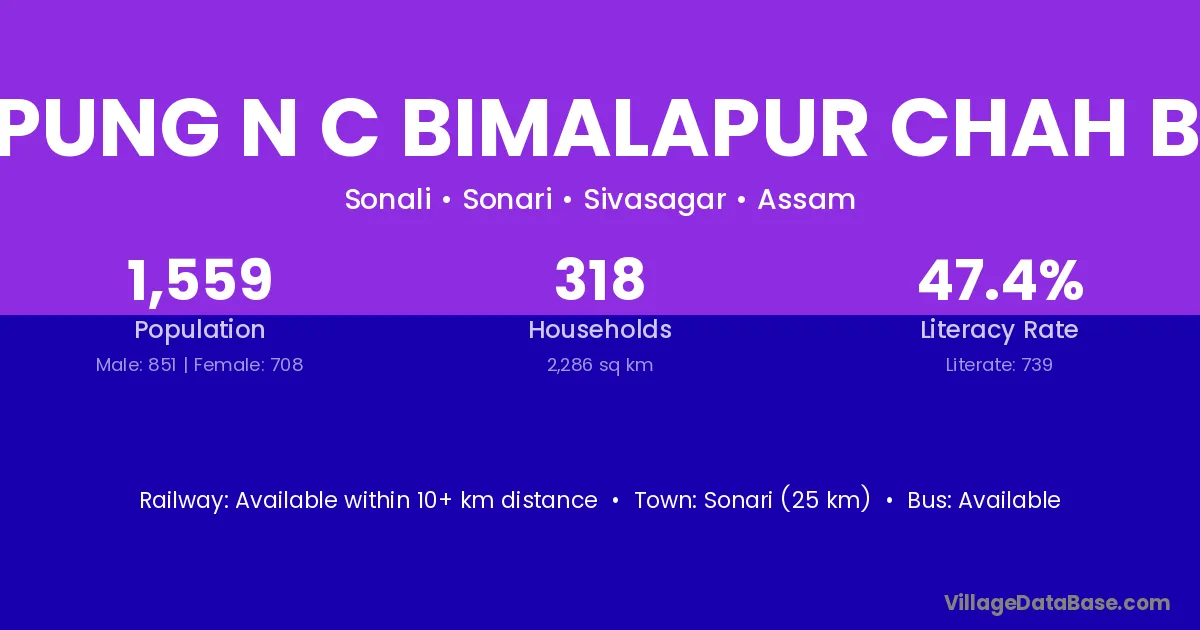 Sonari (25 km) is the nearest town to Charaipung N C Bimalapur Chah Bagicha village for major economic activities and is located approximately 25 km away.
