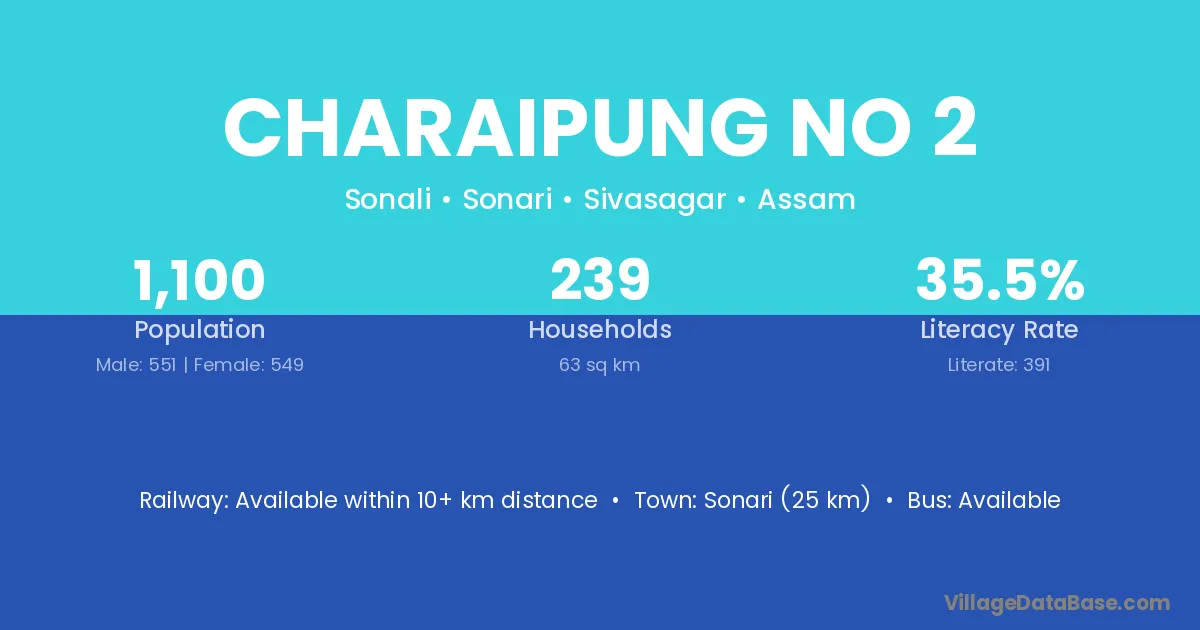 Sonari (25 km) is the nearest town to Charaipung No 2 village for major economic activities and is located approximately 25 km away.