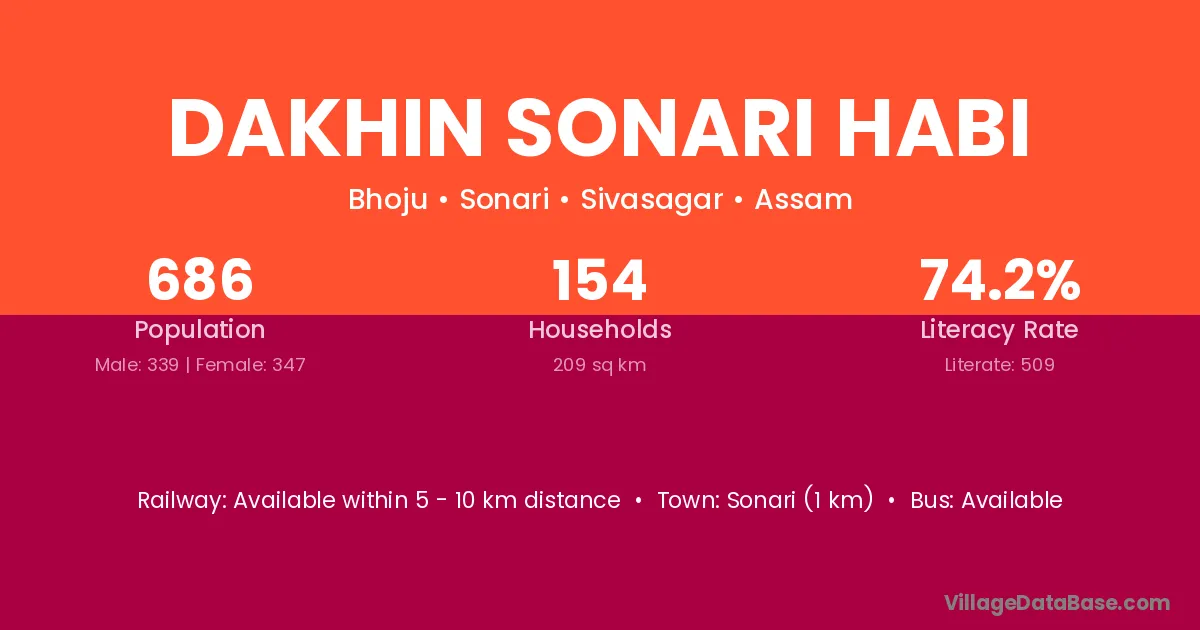Dakhin Sonari Habi village has a total population of 686 people, of which 339 are males and 347 are females.