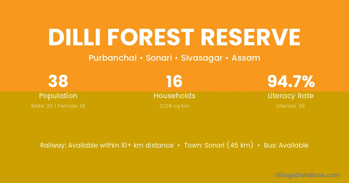 Sonari (45 km) is the nearest town to Dilli Forest Reserve village for major economic activities and is located approximately 45 km away.