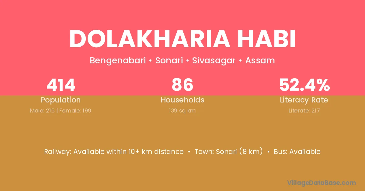 Sonari (8 km) is the nearest town to Dolakharia Habi village for major economic activities and is located approximately 8 km away.