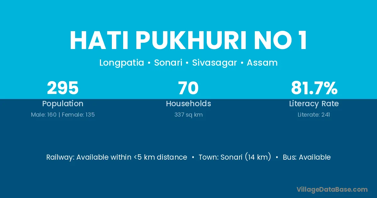 Hati Pukhuri No 1 village has a total population of 295 people, of which 160 are males and 135 are females.