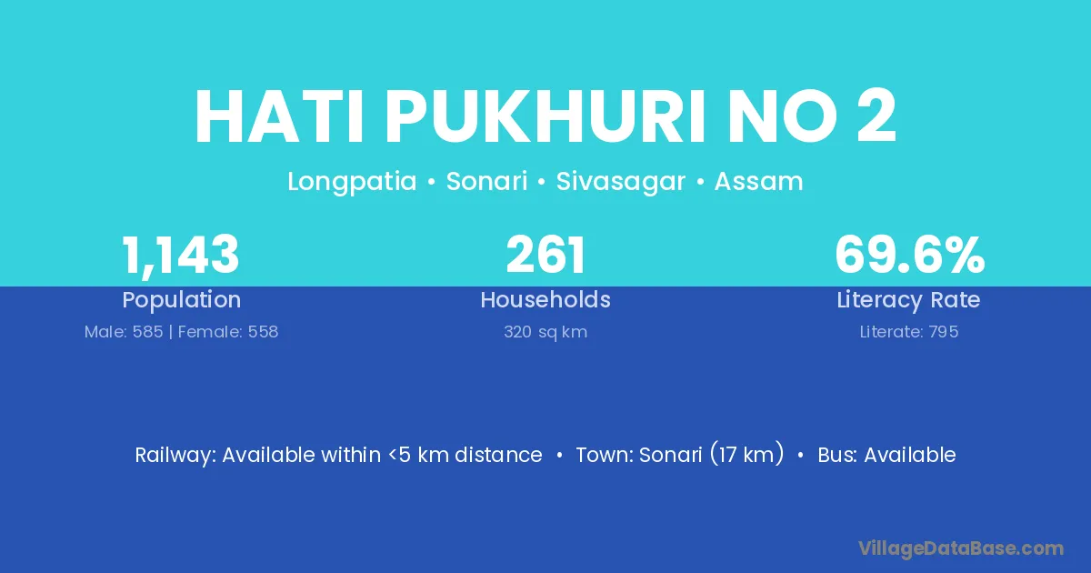 Hati Pukhuri No 2 village has a total population of 1,143 people, of which 585 are males and 558 are females.