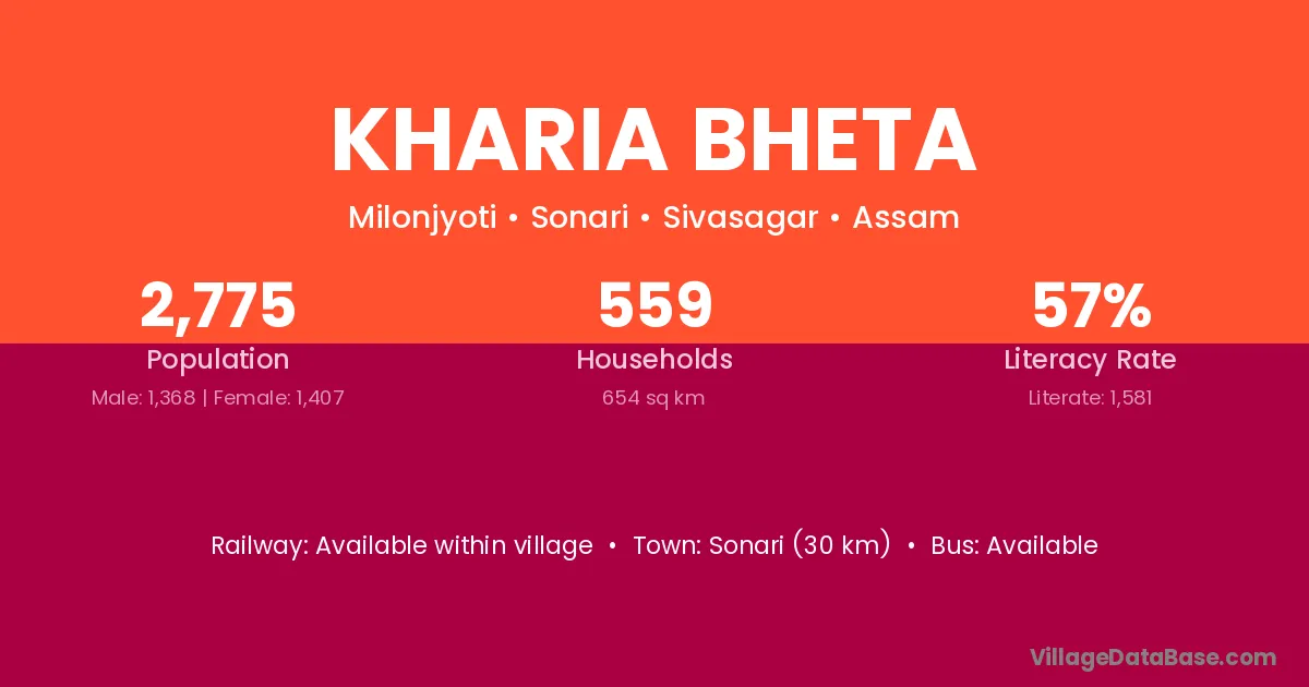 Sonari (30 km) is the nearest town to Kharia Bheta village for major economic activities and is located approximately 30 km away.