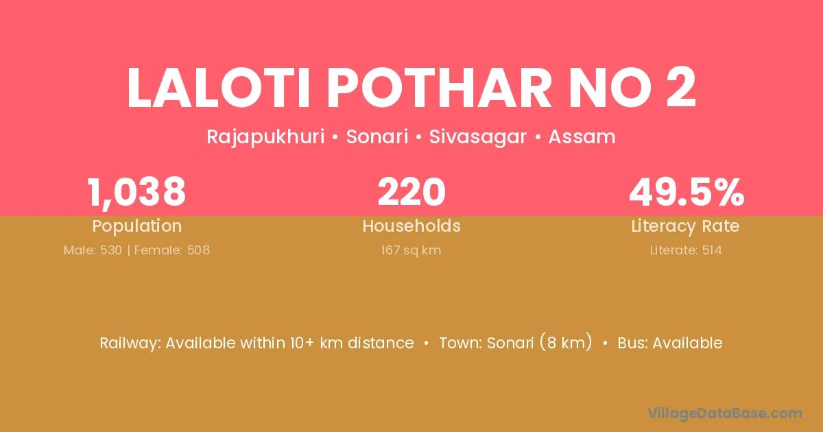 Sonari (8 km) is the nearest town to Laloti Pothar No 2 village for major economic activities and is located approximately 8 km away.