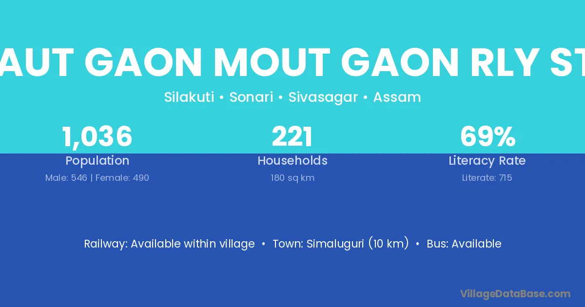 Maut Gaon Mout Gaon Rly Stn village has a total population of 1,036 people, of which 546 are males and 490 are females.