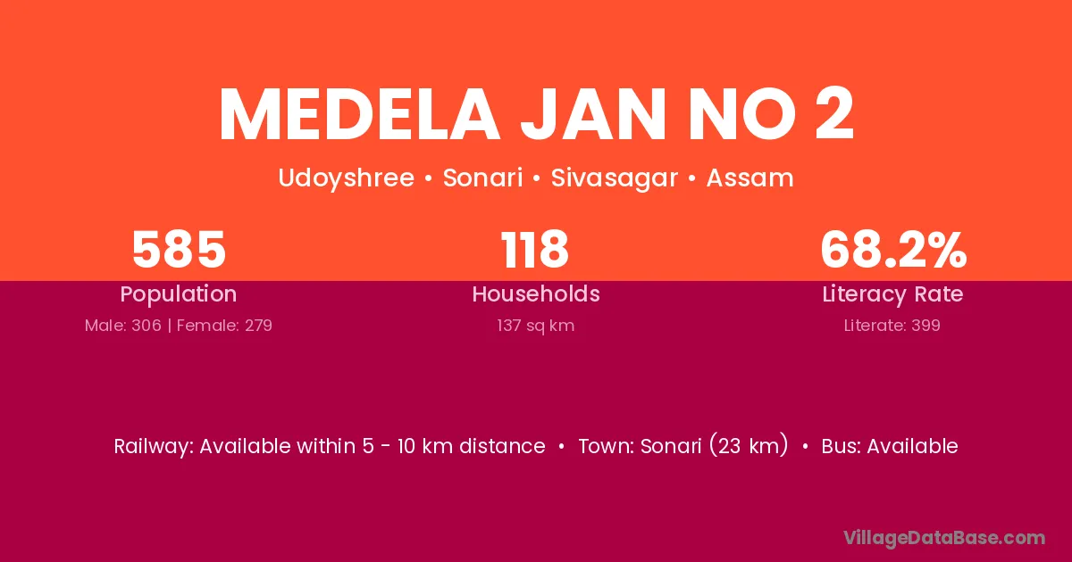 Sonari (23 km) is the nearest town to Medela Jan No 2 village for major economic activities and is located approximately 23 km away.